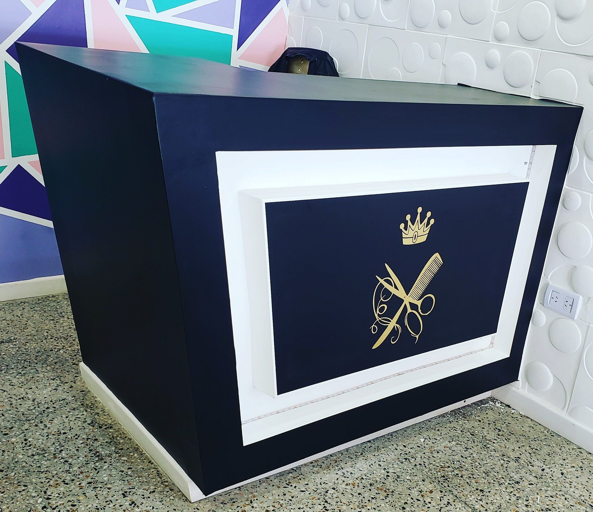 Ploteo completo de escritorio, vinilo calandrado, negro mate con detalle en cepillado oro.